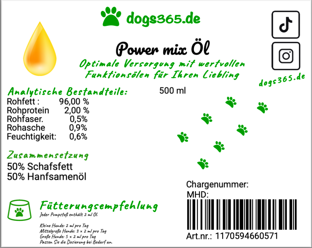 Geef je hond een natuurlijke gezondheidsboost met dogs365.de Power Mix Oil ! Deze unieke mix van schapenvet en hennepzaadolie ondersteunt de spijsvertering, zorgt voor een glanzende vacht en verbetert de opname van voedingsstoffen.